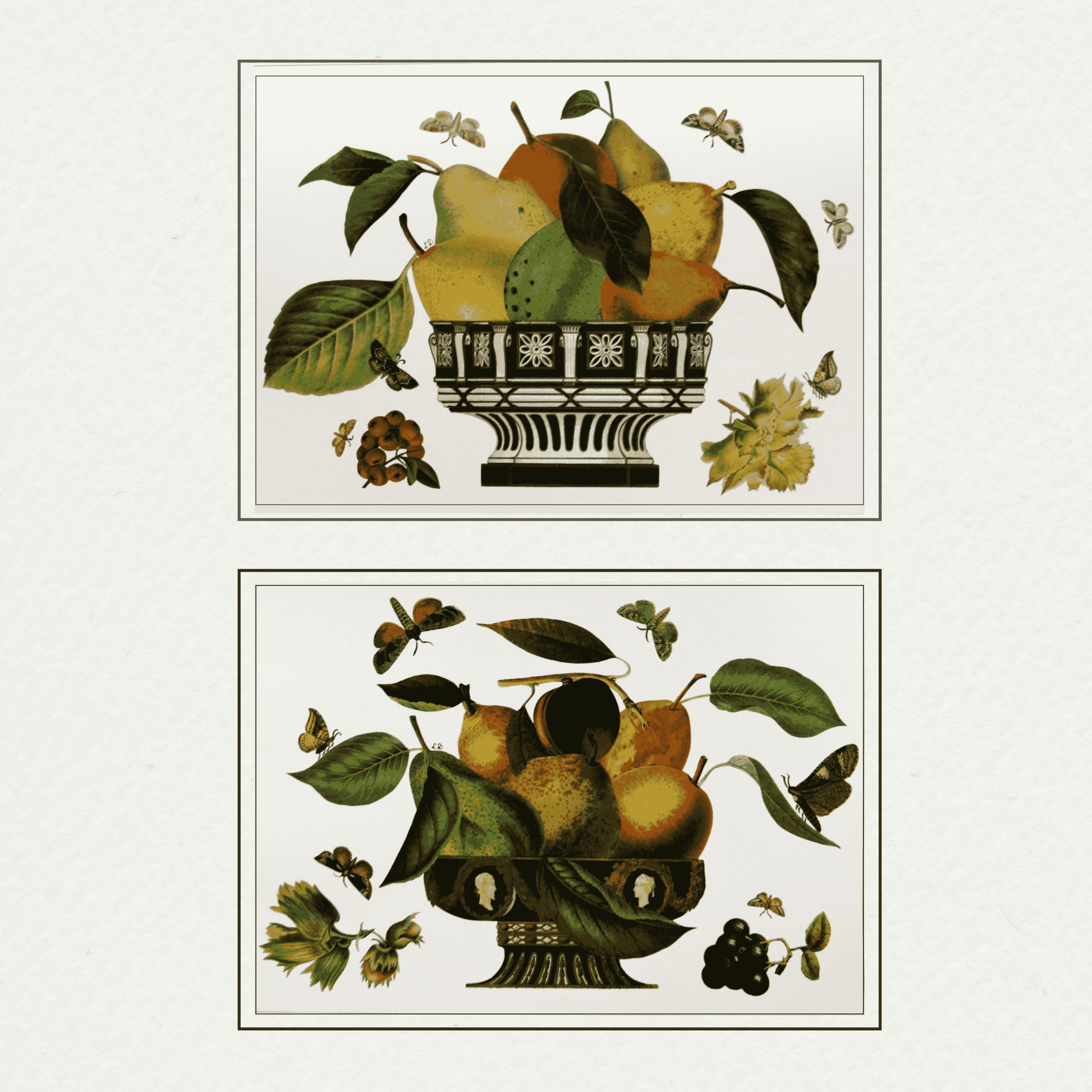 Fruits in Urns are reproductions from a series of French decoupages done in the 1880's. They are available with two prints on a sheet to allow framing as a larger unit or as pairs.