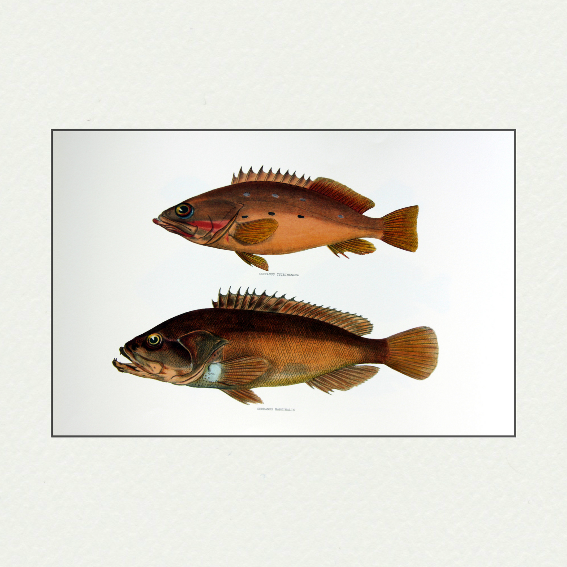 We have reproduced in full color six of the hand colored Japanese Fishes images that appeared in the publication. They make a handsome set in any restaurant or home setting.