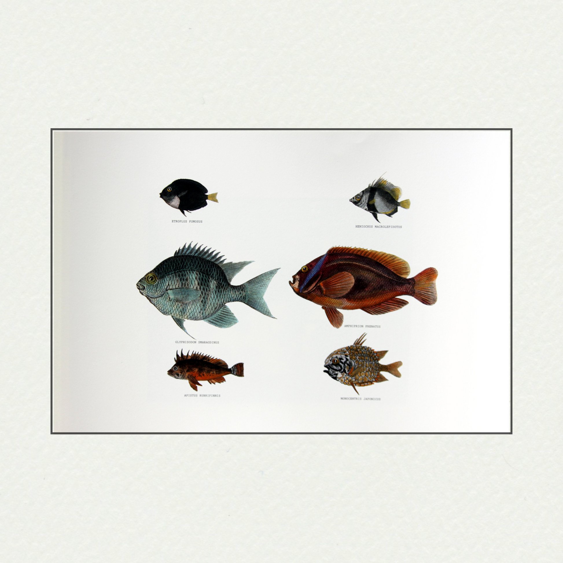 We have reproduced in full color six of the hand colored Japanese Fishes images that appeared in the publication. They make a handsome set in any restaurant or home setting.
