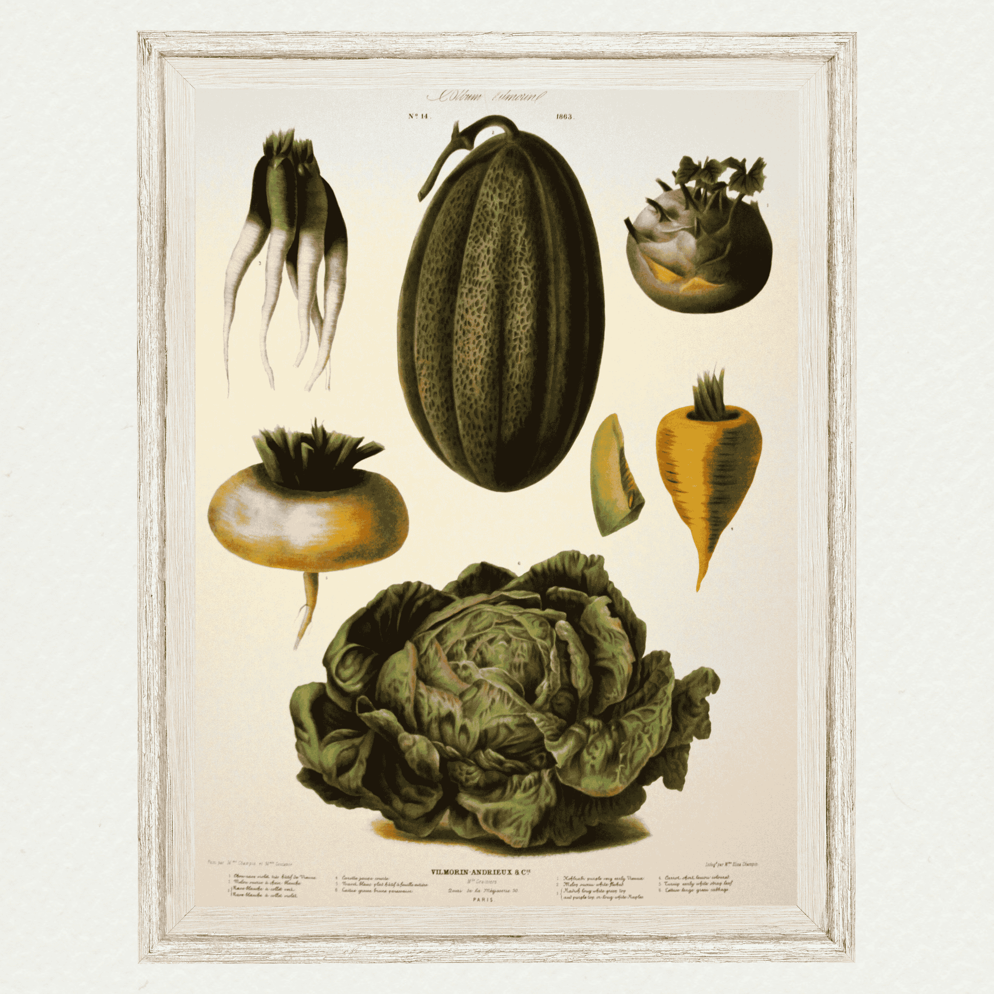 The original Vegetable Garden lithographs were published in a series during the period of 1850 – 1884 by a French seed firm as a promotion of the availability of their variations of garden vegetable stock.